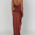 Design: One-shoulder satin maxi dress with asymmetrical neckline and high slit